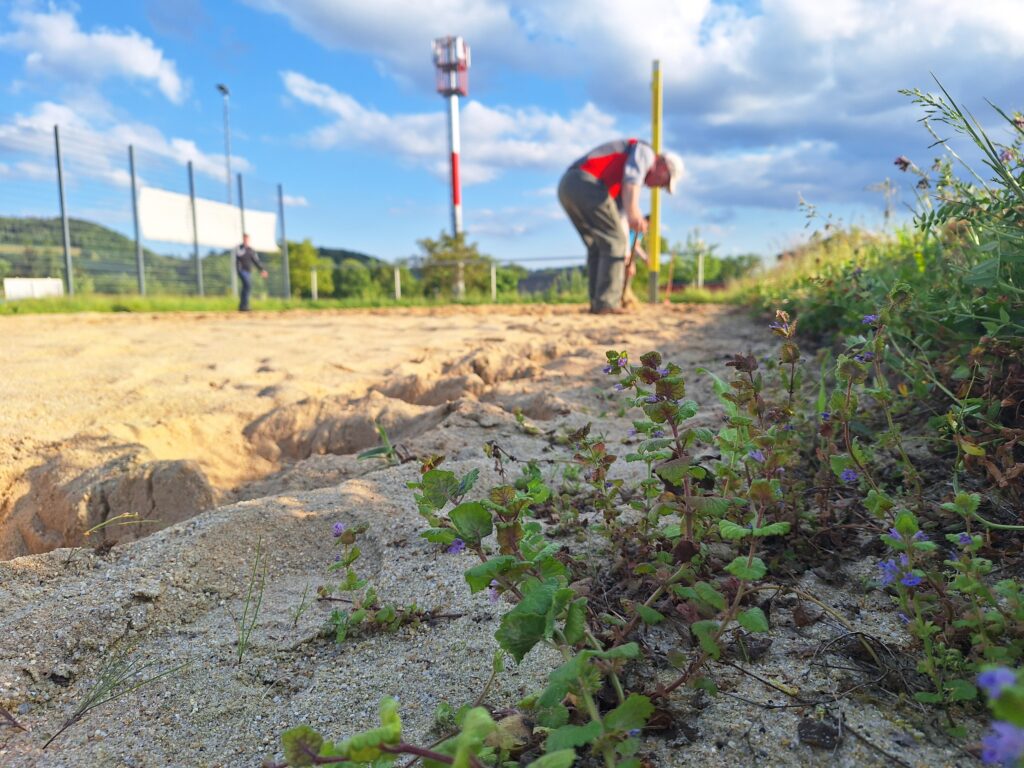 Beine und Po: Lästiges Unkraut in unserem Beachfeld wurde entfernt.